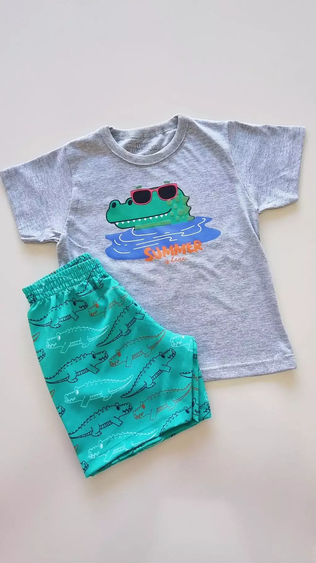 Conjunto Camiseta Meia Malha e Bermuda em Tactel Estampa Jacaré.